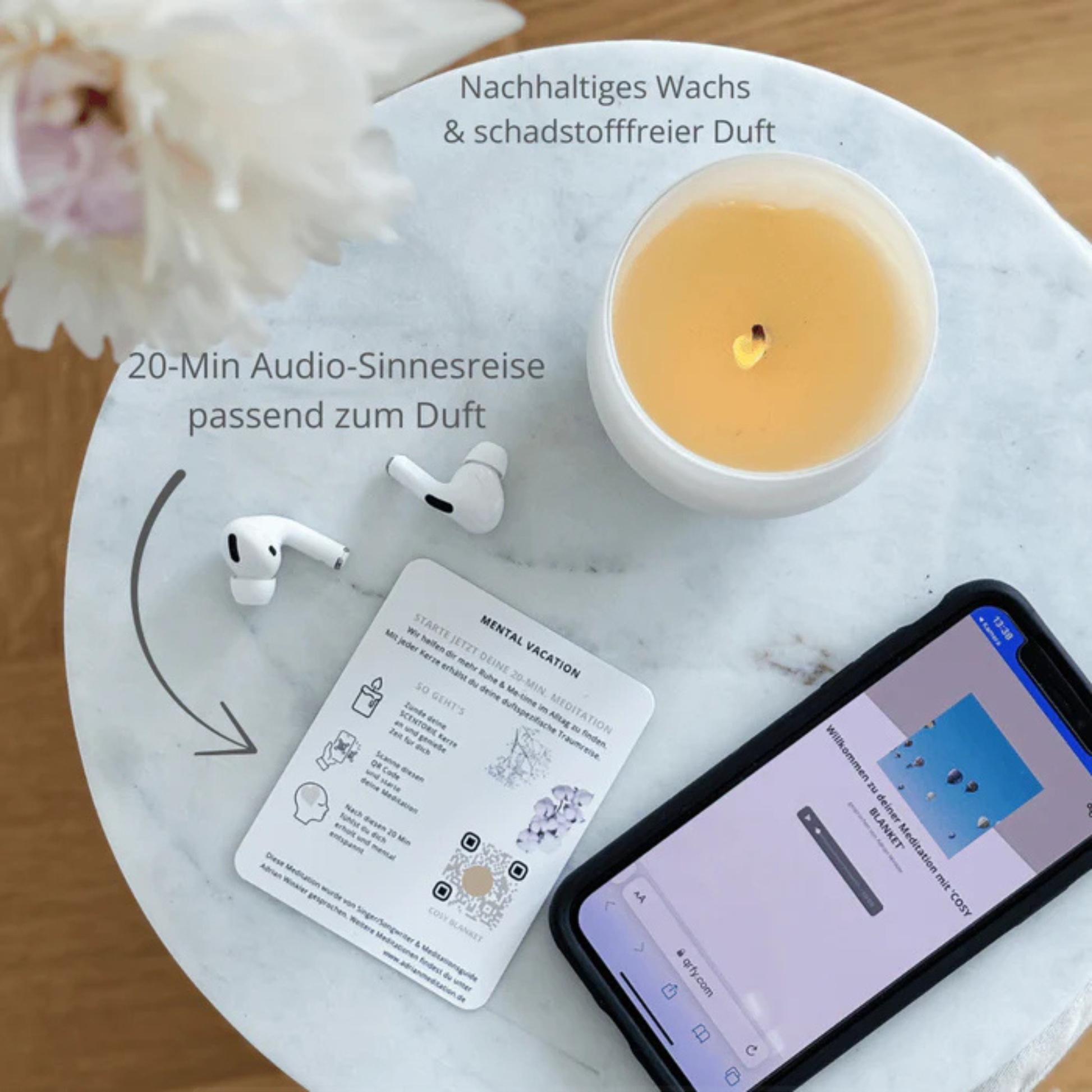 Entwickelt mit Psychologen, Meditationsguides und Müttern. 20-minütige Erholung für deine Selbstfürsorge im Alltag. Unterbewusste Entspannungstechniken. Duftspezifische Sinnesreise, passend zu deiner Kerze.