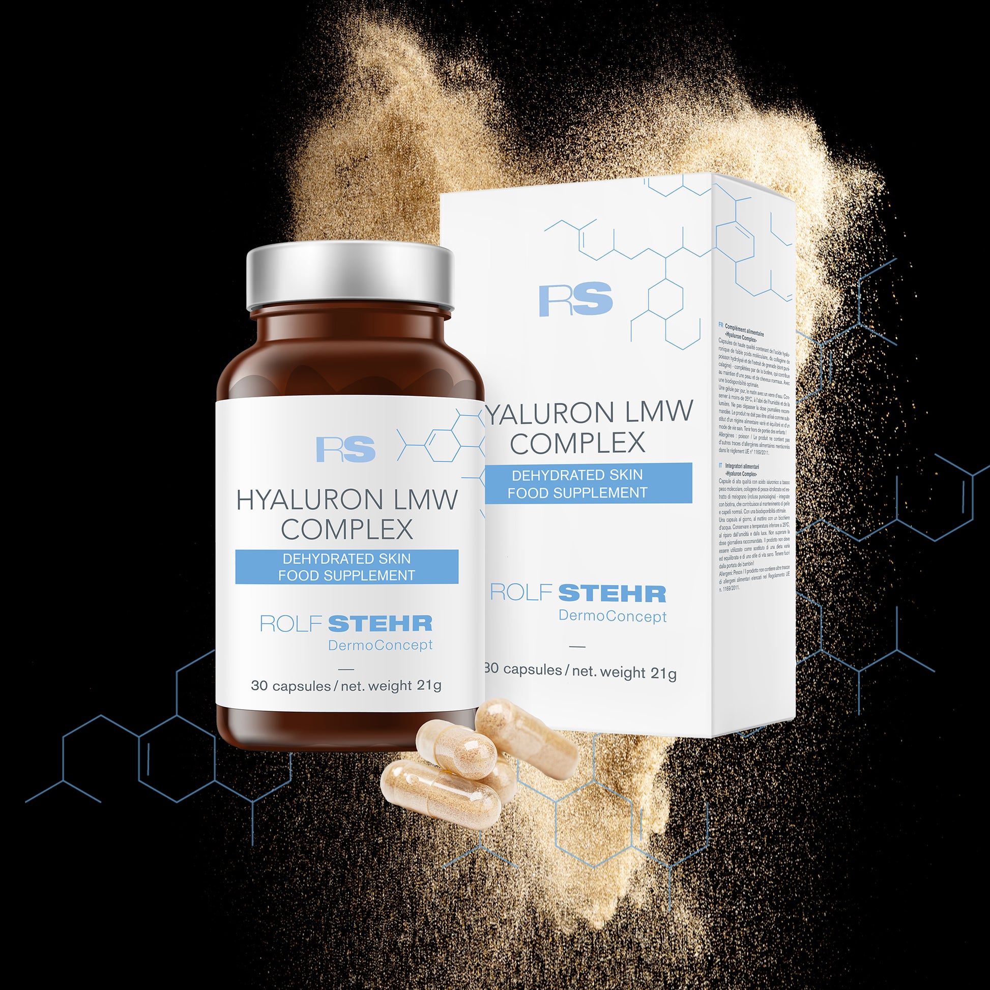 Hochwertige Kapseln mit niedermolekularer Hyaluronsäure, hydrolysiertem Fischkollagen und Granatapfelextrakt (davon Punicalagin) – ergänzt mit Biotin, das zur Erhaltung normaler Haut und Haare beiträgt. Mit optimaler Bioverfügbarkeit.
