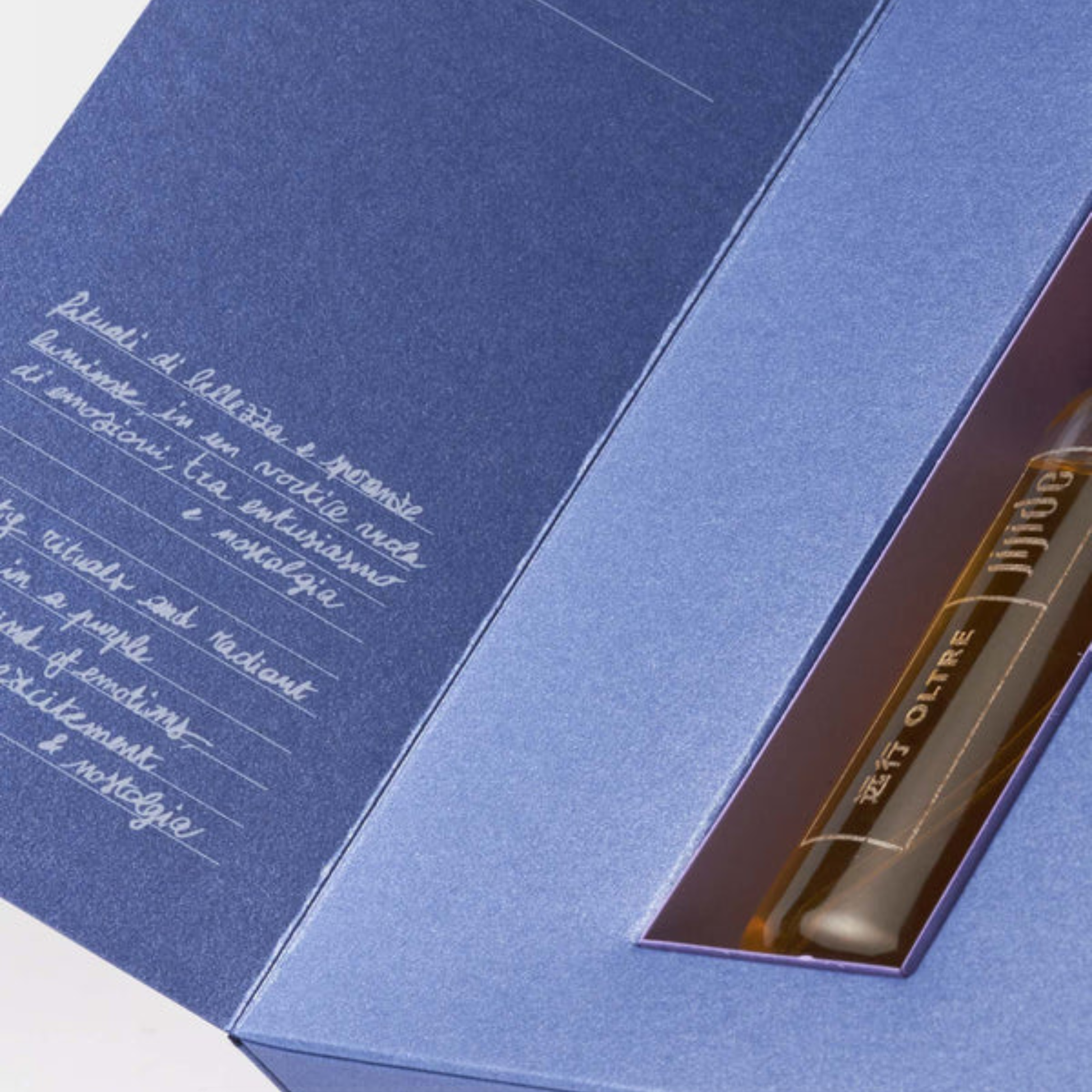 Oltre erzählt die Geschichte des Aufbruchs mit einem klaren, leuchtenden Duft, der von neuen Anfängen spricht. Ein Herz aus Lavendel, Dampfakkorden und metallischen Noten erinnert an die entschiedene Bewegung eines heissen Bügeleisens über ein weisses Hemd. Die Akkorde von Make-up und Gesichtscremes, ergänzt durch Parma-Veilchen, verleihen nostalgische und vintagehafte Nuancen – Schönheitsrituale, die über Generationen weitergegeben wurden.